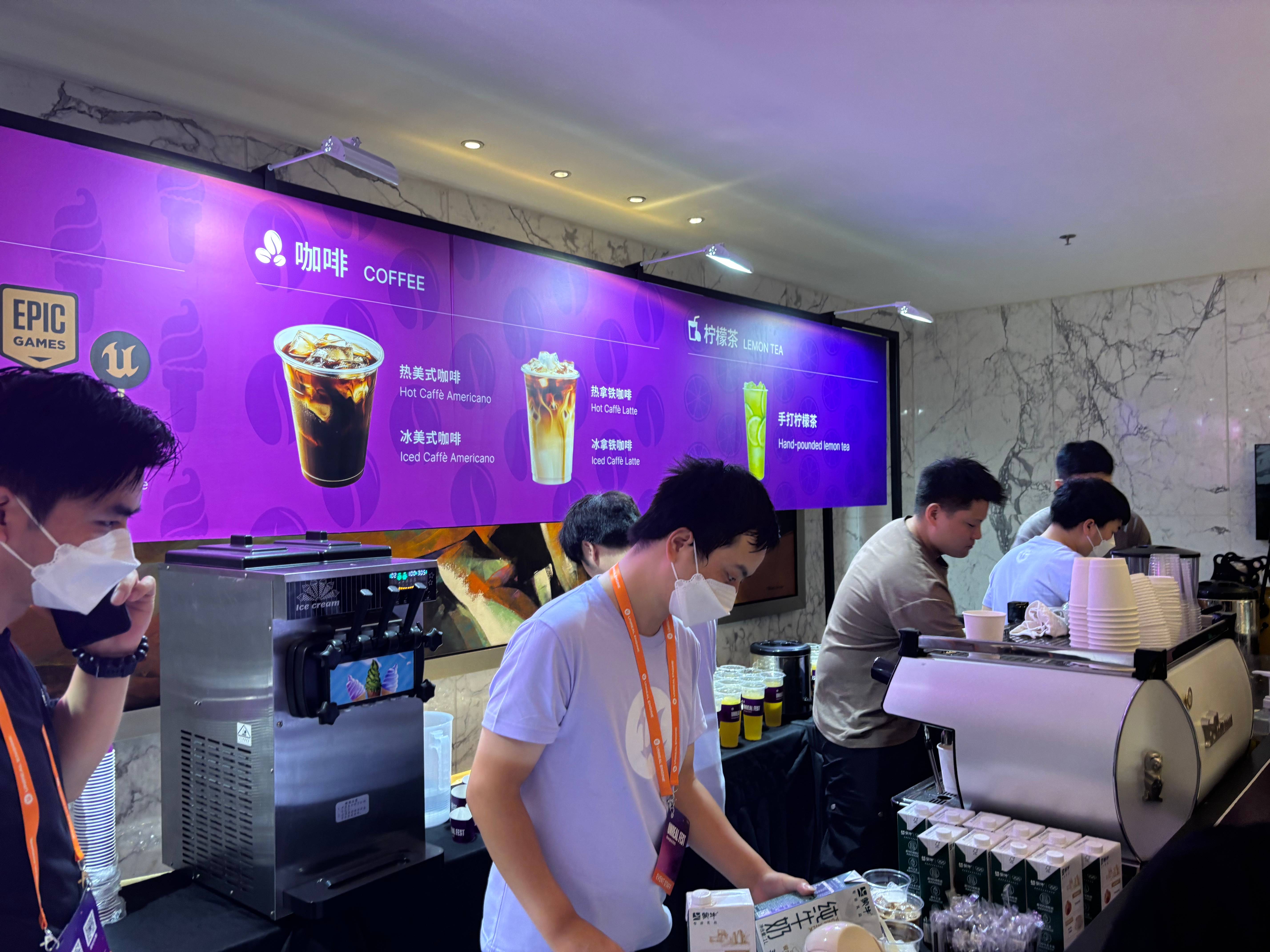 接着,进入二楼的举办地,楼梯口对面就是虚幻饮吧,有免费的咖啡和雪糕可以无限畅饮,真的很好吃!!!