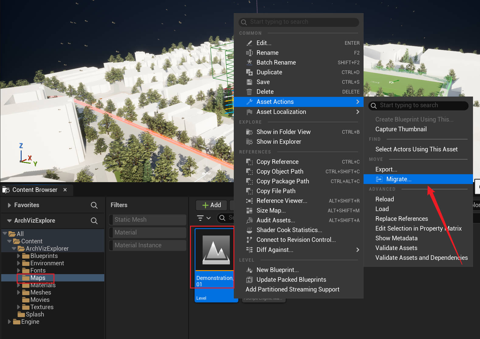 首先打开ArchViz Explorer 这个项目,将主关卡整体进行Migrate到自己创建的工程中的Content文件夹中: