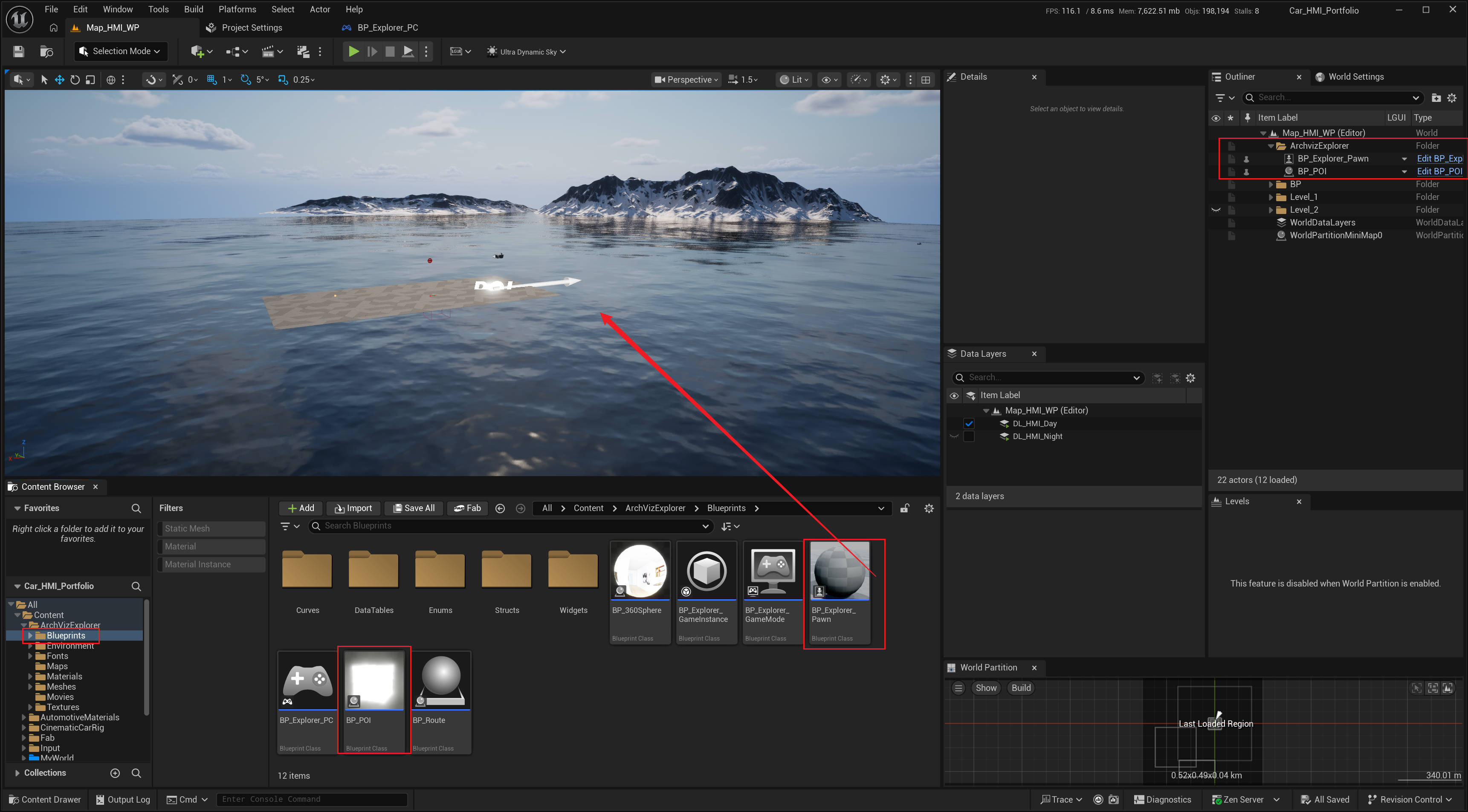 然后打开Content中的”ArchViz” Explorer文件夹中的Blueprint部分,将下面两部分拖入主关卡场景中: